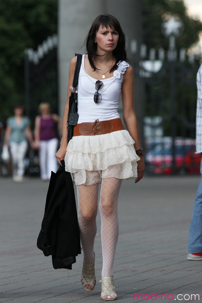 Вулічная мода ў Мінску. 08/2011. Fashion Scooter Fest 2011 (нарады і вобразы: белы топ, белая спадніца міні, карычневы рэмень, белыя басаножкі, белыя ажурныя калготкі)