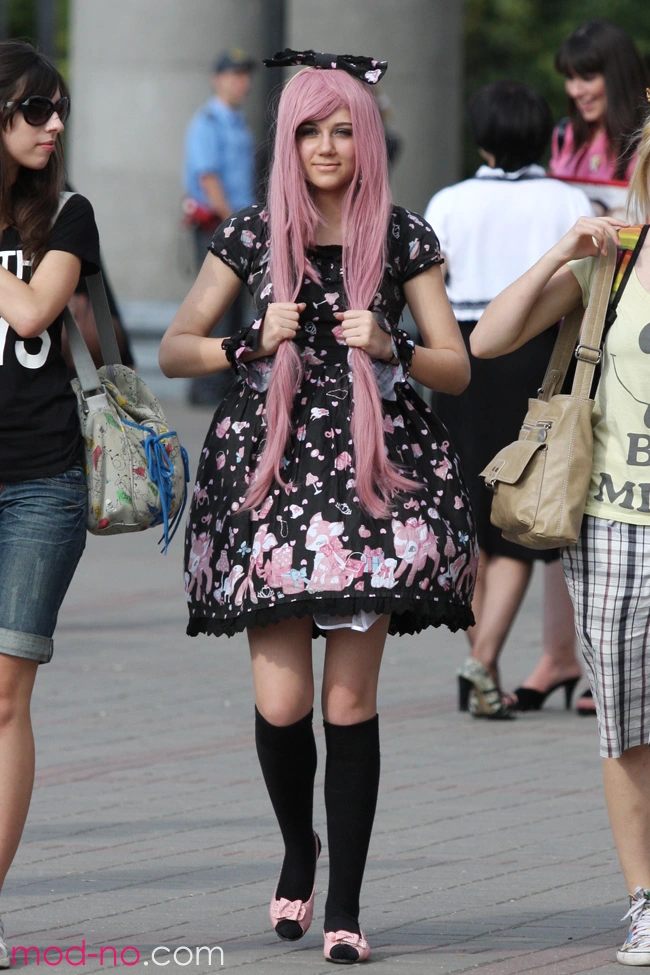 Вулічная мода ў Мінску. 08/2011. Fashion Scooter Fest 2011 (нарады і вобразы: чорная сукенка з прынтам, чорны бант, чорныя гольфы, ружовыя туфлі)
