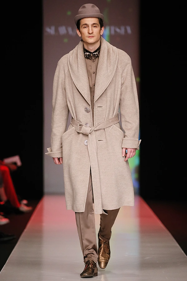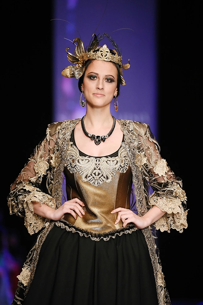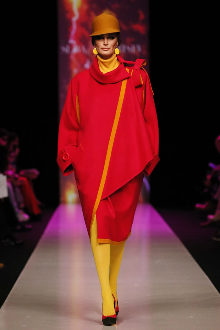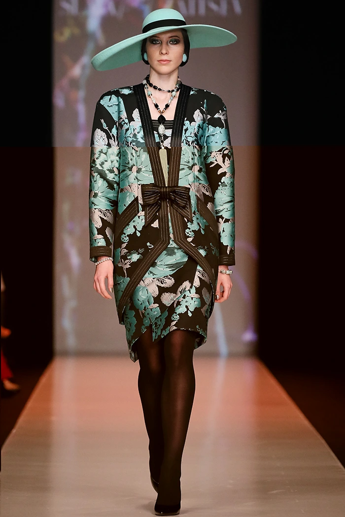 Роскошные силуэтные наряды, стильная верхняя одежда из жаккарда и цветного сукна, костюмы-тройки и коктейльные платья – женственность здесь воспета и возведена в культ. Центральной моделью стало платье невесты, дополненное причудливым головным убором, ассоциативно отправляющим к истокам русских сказок.