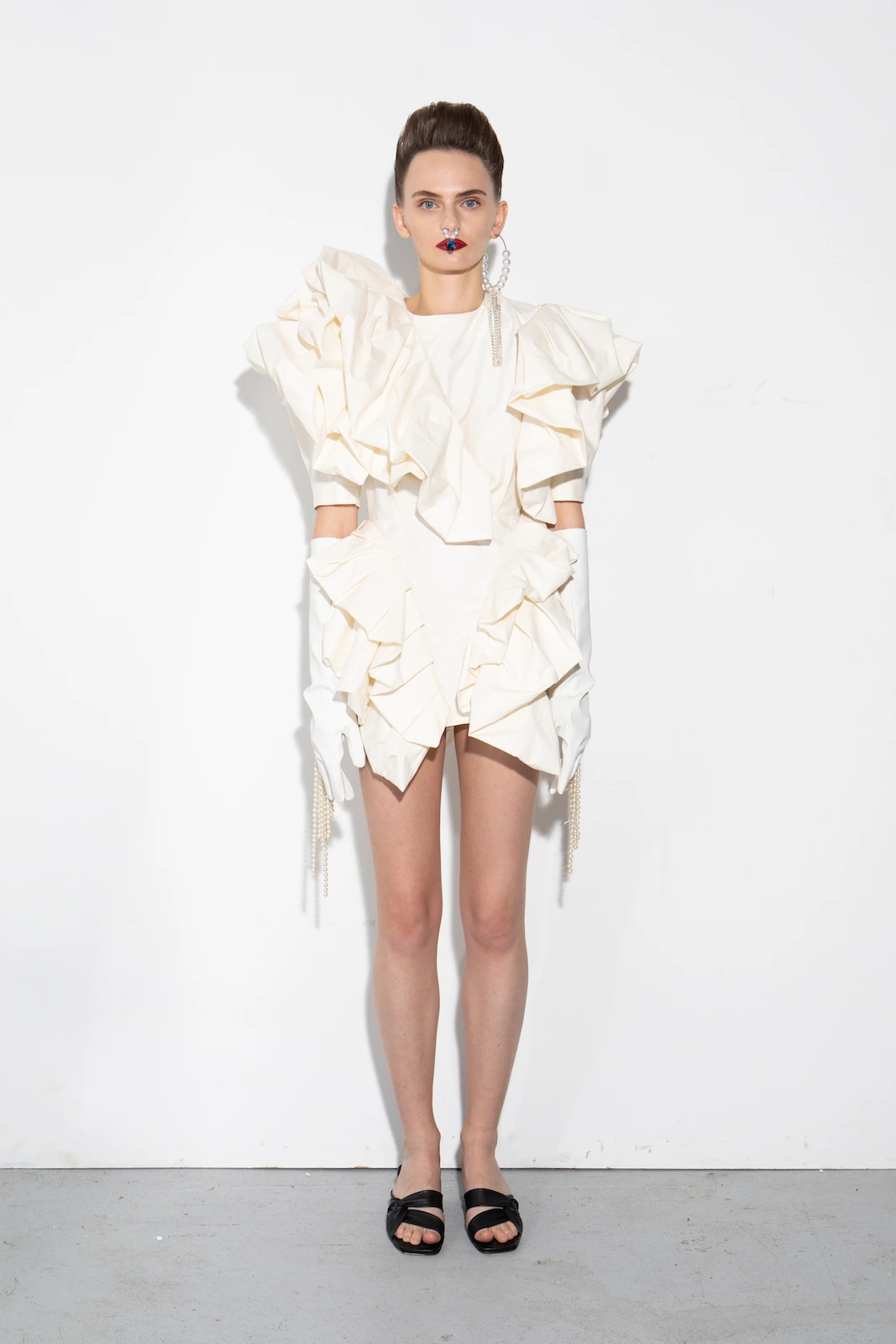 Lookbook Aleksandra Seweryniak FW 19/20 (ubrania i obraz: sandały czarne, suknia koktajlowa czarna, długie rękawiczki w groszki białe przejrzyste)